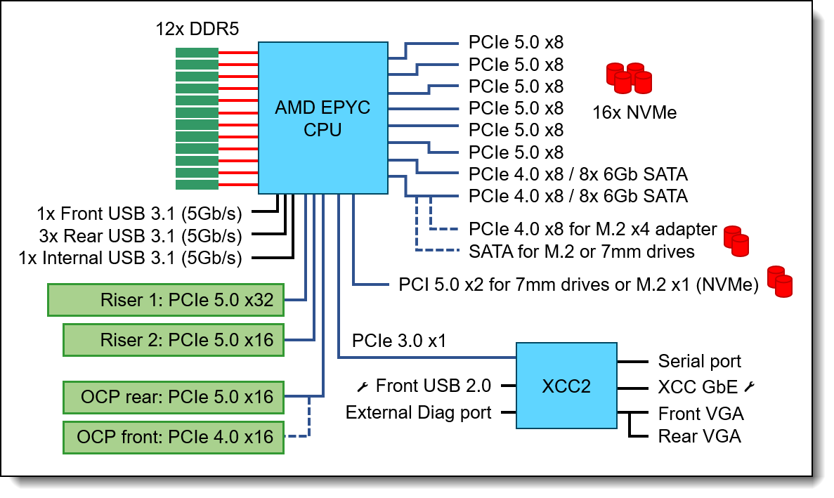 Figure 1: Full PCIe lane allocation for a single-socket server. Source: Lenovo Press (2025).